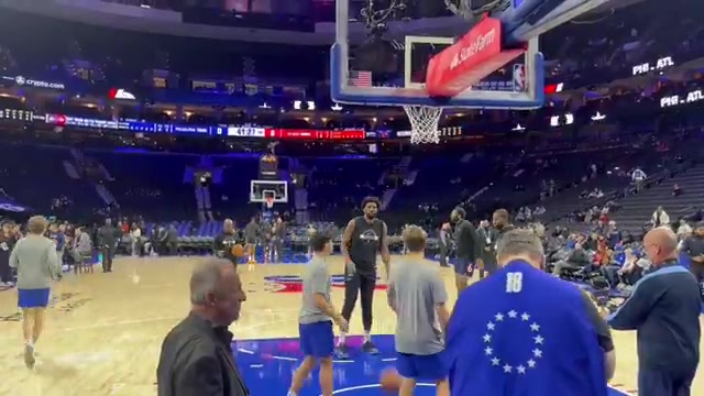 - 目前状态出战成疑!恩比德赛前热身 一顿训练罚球未见跑跳